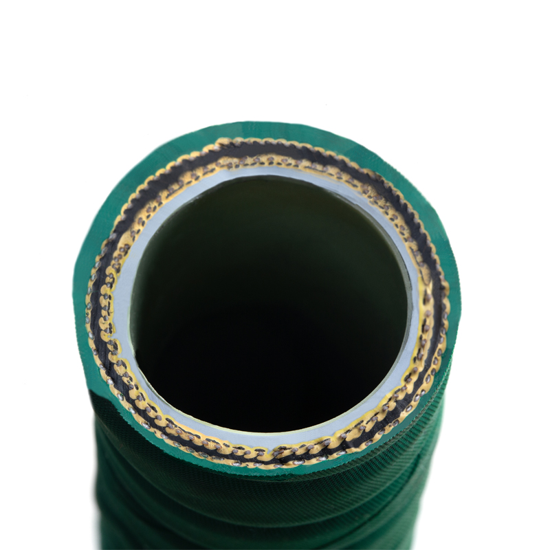 表面:CR外膠,黑色內襯:EPDM內襯,黑色加強層:尼龍,旋轉紋道覆蓋黑色,無針孔,光滑,EPDM內襯工作壓力可達30bar(取決于口徑大小)溫度范圍為–30°Cupto+100°C,可以蒸汽清洗可達130°C高溫(可以有30分鐘)加強層:合成纖維不彎曲,防震,耐碾壓耐臭氧和UVC