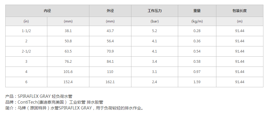 內膠:黑色丁腈合成橡膠。外膠:黑色WINGPRENE氯丁耐油的合成橡膠,靜電消散/導靜電。增強層:4層合成纖維螺旋纏繞及1層能使膠管骨架變堅硬的尼龍纏繞層。溫度:-35℉到200℉(-37℃到93℃)顏色:黑色內徑外徑工作壓力爆破壓力包裝重量inmminmmpsiMpapsiMpaFT/ReelKg/m11/238.102.0652.323002.0712008